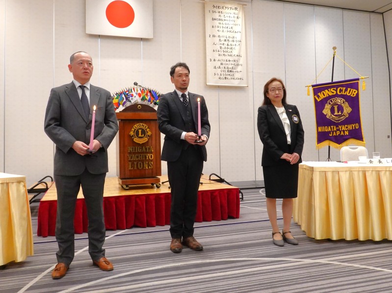 本日の例会は、新入会員入会式でした。会長による歓迎のキャンドル点火と、ライオンズの誓い唱和を行い。小嶋篤さんと、河内大輔さんが仲間に加わりました。