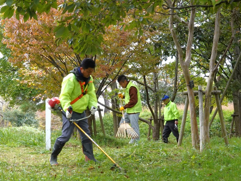 江南区の大江山公園で、2001年、クラブ認証35周年記念事業で植樹した 「八千代の杜」 の草刈りをしました。
