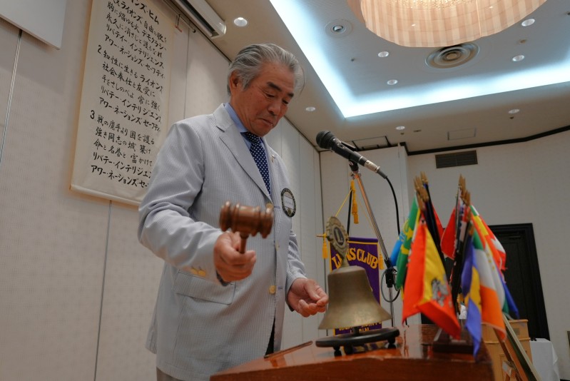 新会長へ槌の伝達、その後、新会長のL山本建治がゴングの打ち始めを行いました。